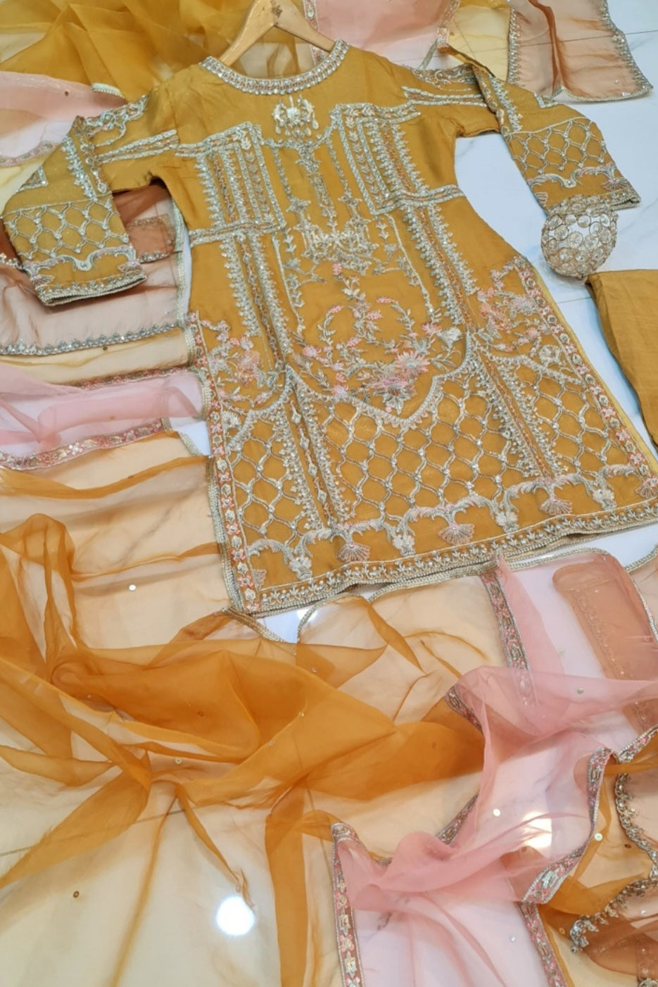 SHIRT FABRIC: ORGANZA TROUSER FABRIC: SILK DUPATTA: ORGANZA SHIRT LENGTH: 39 INCHES TROUSER LENGTH: 39 INCHES LARGE...